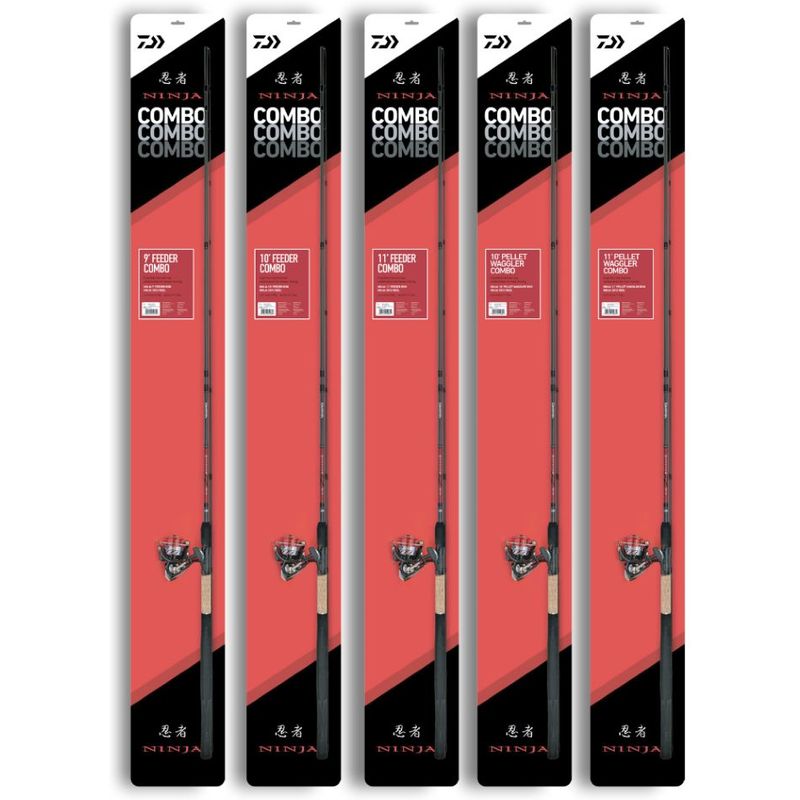Daiwa Ninja Feeder Combos are well matched rod and reel outfits. Manufactured from premium grade carbon fibre blanks, fitted with stainless steel titanium oxide rings and high quality DPS downlocking reel seats. The shorter 9ft model is perfect for scratching for delicate bites on commercial venues in the colder months, while the longer models are ideal for distance fishing on a range of waters. The 3000 sized Daiwa Ninja match & feeder reel is ideal for use with mono and braided mainlines and with a smooth winding action enhanced with 4 Ball Bearings and an Infinite Anti-Reverse. The graphite body combined with Air Rotor saves weight and the enhanced rotor shape aids their performance under load. All assisted by a geared down retrieve for higher winding power.