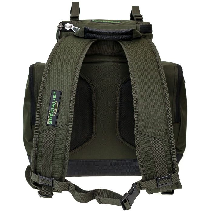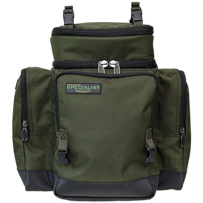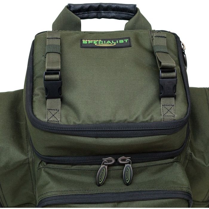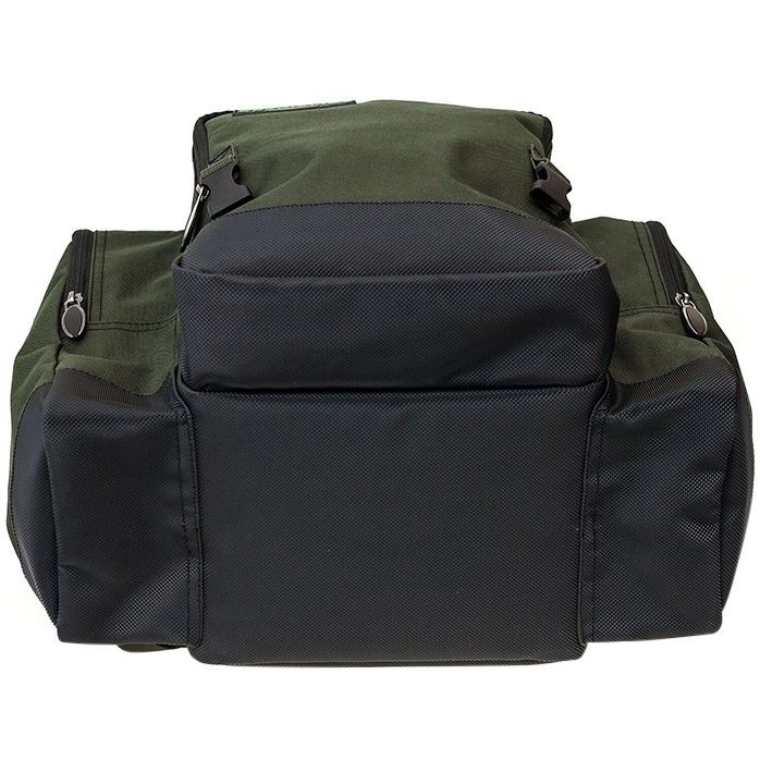 The rucksack is made from a tough and durable 600 denier fabric with a reinforced waterproof base. The bag has three external zipped pockets, along with a foil-lined top compartment which is ideal for storing bait and other items of tackle. The inside of the bag is padded and also has an internal clear zipped pocket on the bottom of the lid.