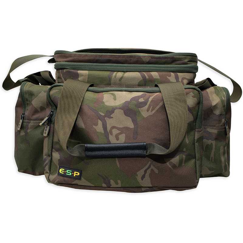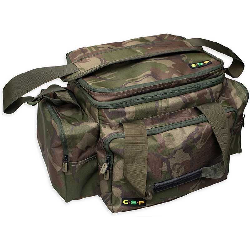For the travelling light, short session/overnight angler, the medium Carryall is a perfect size. Although compact, it can still accommodate a large amount of kit and features three roomy zipped external pockets. The front pocket comfortably fits any medium-sized plastic tackle box and the rear open topped pocket is ideal for storing spare clothing and/or carp sacks, while the zipped lid to the central compartment features a padded buzzer bar/short bankstick pocket so those essentials are to hand for a quick set-up.