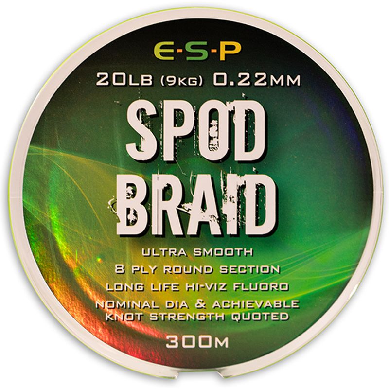The high-viz fluoro green colour helps deter gulls when spodding. The fine 0.22mm diameter and tightly woven construction means that extreme distances can be achieved (best used with ESP Shock Leader for long range with big spods).
