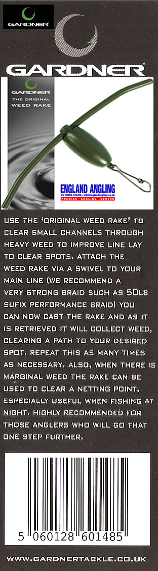 The original concept for a weed rake as used by the carpy guys on the Yateley complex developed to improve line lay in weed by clearing small channels. All metal construction. Supplied with ring and swivel for attachement to main line. Coated with a green finish.
