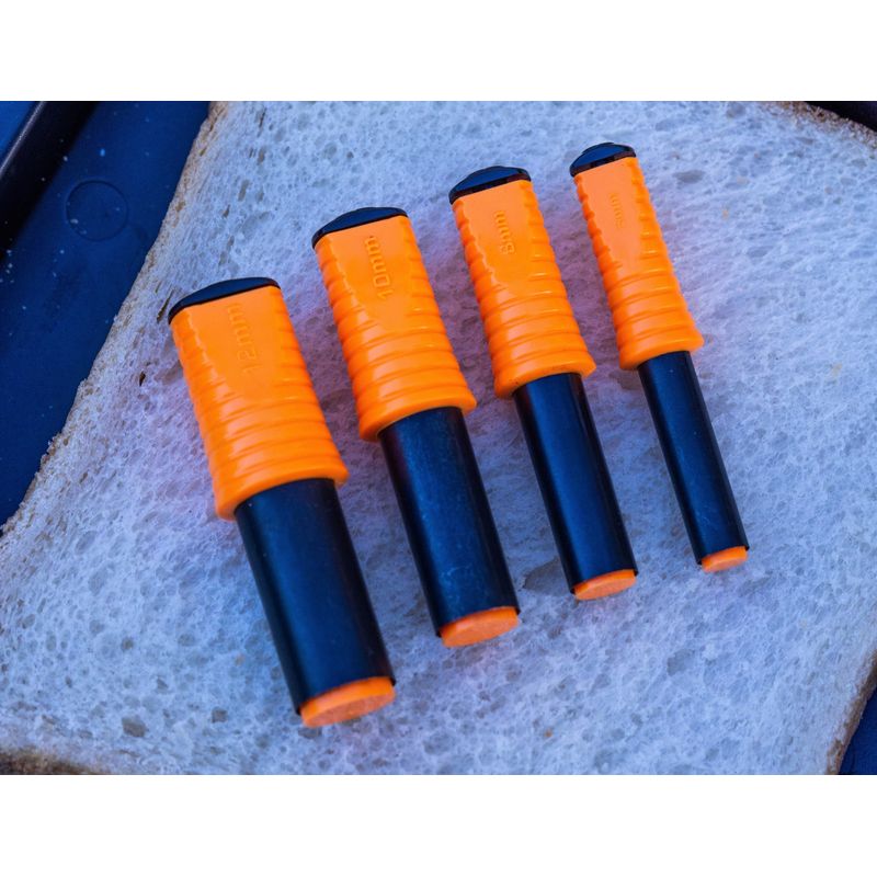 4 Sizes are included: 6mm, 8mm, 10mm & 12mm. Stainless steel punches. Ultra-sharp for a neat cut. Plunger in the handle for trouble free bait release. Ideal for baits such as bread, meat, paste, etc. Can also be used for punching out boilies and other hard baits.