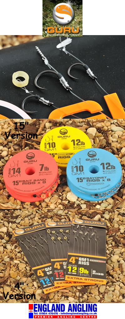 The all-conquering QM1 hooks are now available on ready-tied rigs, in 15 and 4-inch versions and with Speedstop, bayonet and bait band attachment options. The 15-inch versions are supplied on EVA spools, so they can be dropped straight into the Guru Rig Box and the 4-inch versions can be housed in the Rig Case.