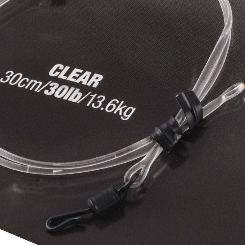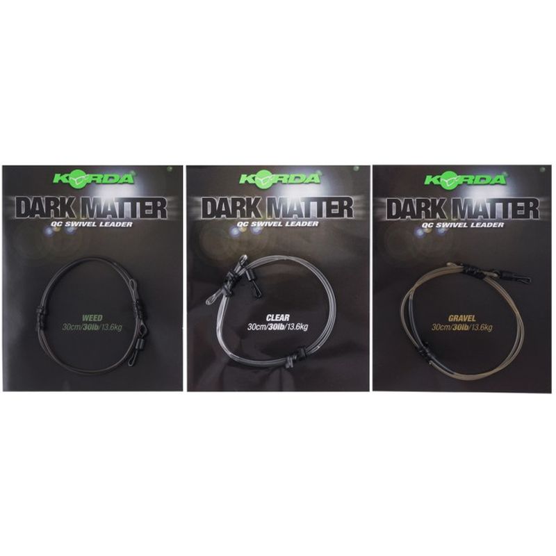 The Dark Matter QC Swivel Leader is particularly suited to fishing with inline leads, standard Lead Clips or running rigs. At one end there is a size 8 QC Swivel fused onto a loop, which neatly fits into an inline lead and makes it very quick and easy to change hook link, and at the other is a fused loop which your main line is attached to – loop-to-loop style is easiest if you want to take your leader off. It pins everything to the lake bed thanks to the tungsten collars that are fused into the 30lb breaking strain leader. It comes in a choice of 30cm or 50cm long leaders, as well as a 40lb breaking strain Euro version which is 50cm long. All are available in a choice of clear, weed or gravel colours. You get one leader per pack.