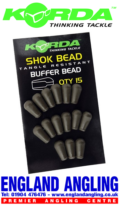 Pack of 15. Korda Shok Beads have been specifically designed for a multitude of uses. Its unique shape helps prevent tangles and the cavity will hold a swivel within it securely. Ideal for running rigs or for using with marker floats or any other set up that requires a buffer type bead.