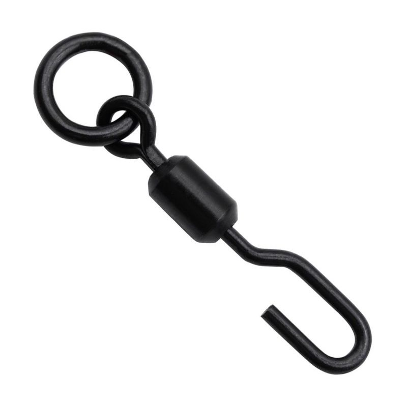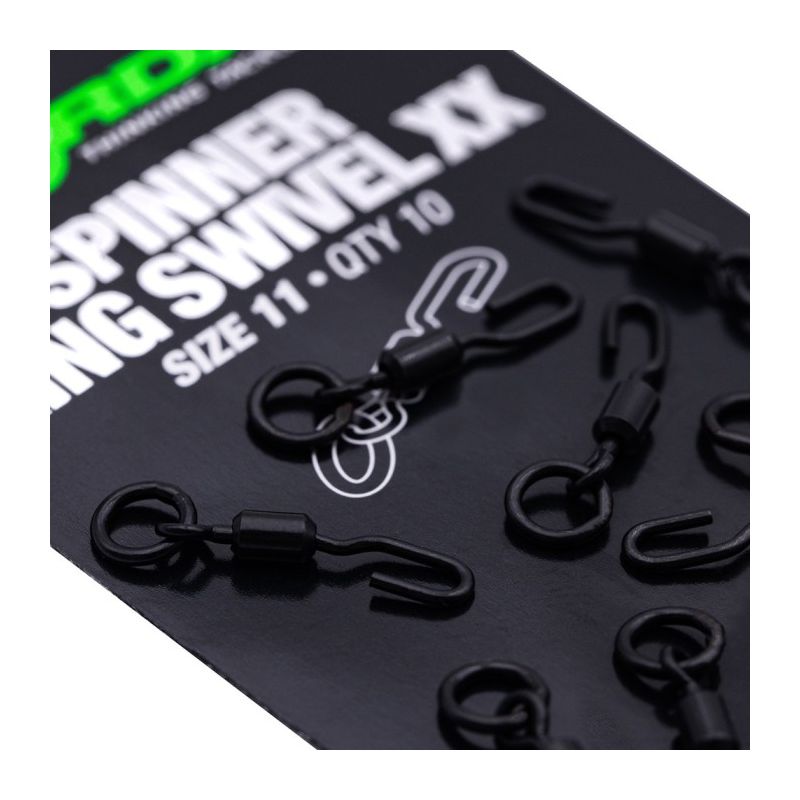 The Spinner Ring Swivel has been specifically designed for use with spinner rigs and does away with the need to make do with other types of swivels which arent made for that purpose. Previously using a spinner rig often involved having to use a pair of pliers to open up a QC Swivel or similar and jam the hook onto it, but these have a crooked shape opening which the hook can easily be slid onto, and then a piece of shrink tubing or Kicker is used to cover the connection and keep everything in place and sitting at the right angle. This size 11 swivel also helps to create very neat spinner boom sections, with the ring at the other end of it giving plenty of movement and allowing you to crimp tightly to it, or if youre using more supple materials which are being tied directly to the ring. The XX version is designed specifically to be used with larger hook sizes such as 1s and 2s. They have a thicker wire gauge than the original version and should be used in conjunction with the new XL Kickers which will sit snugly over the crook and the larger eye of the bigger size hook. They are sold in packs of ten with a version without a ring also available.