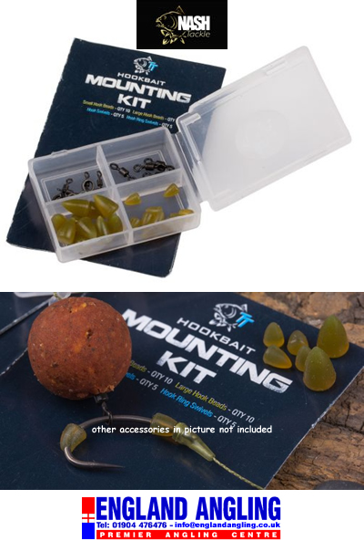 The Hookbait Mounting Kit includes both large and small Diffusion Camouflage Hook Beads plus Hook Swivels and Hook Ring Swivels for sliding hairs, improved anti-eject properties and creating aggressive fast turning rigs.