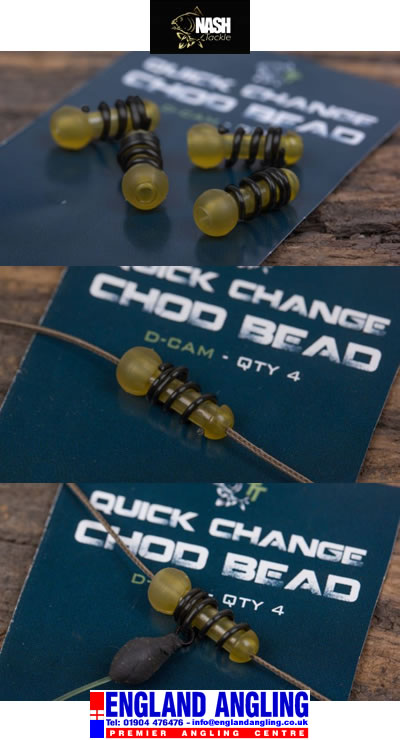 Brilliant Nash Terminal Tackle innovation, Diffusion Camouflage Quick Change Chod Beads pull apart to allow chod and helicopter hooklinks to be replaced in seconds, without tying knots or breaking end tackles down.