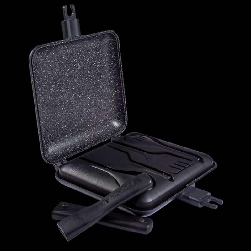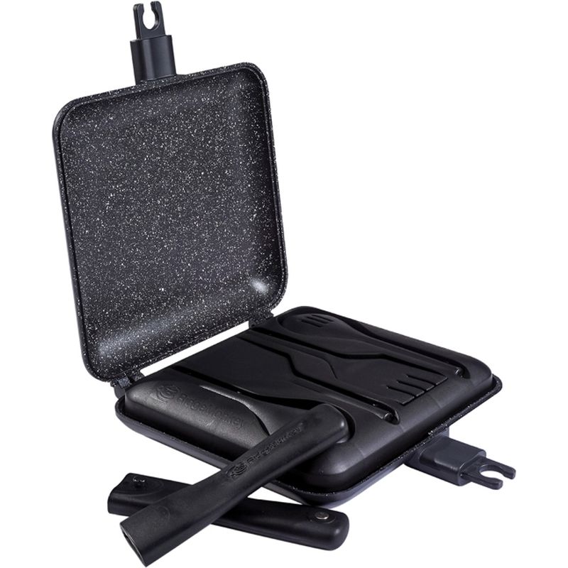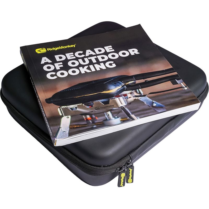 RidgeMonkey Connect Sandwich Toaster XL 10th Anniversary Limited Edition, This special edition of our iconic best-selling Connect Sandwich Toaster XL features some smart new additions to celebrate reaching this milestone birthday. The pan itself features the same detachable hinge system and removable cool-touch handles that pack away inside the included 4-piece utensil set, which itself nests neatly inside the non-stick granite edition pans. This bundle features our very own Cookbook, A Decade Of Outdoor Cooking, featuring over 70 of our favourite recipes from the last 10 years that you can perfect using our Cookware whilst enjoying the great outdoors. The book fits snugly in the inside zipped pocket of the carry case, so you can be sure to have it with you as inspiration on your outdoor adventures. The subtle but stylish 10th Anniversary branding is embossed onto the outside of the pans and the carry case, as well as appearing on the zipped neoprene pouch which keeps the aluminium pan from rattling during transit.